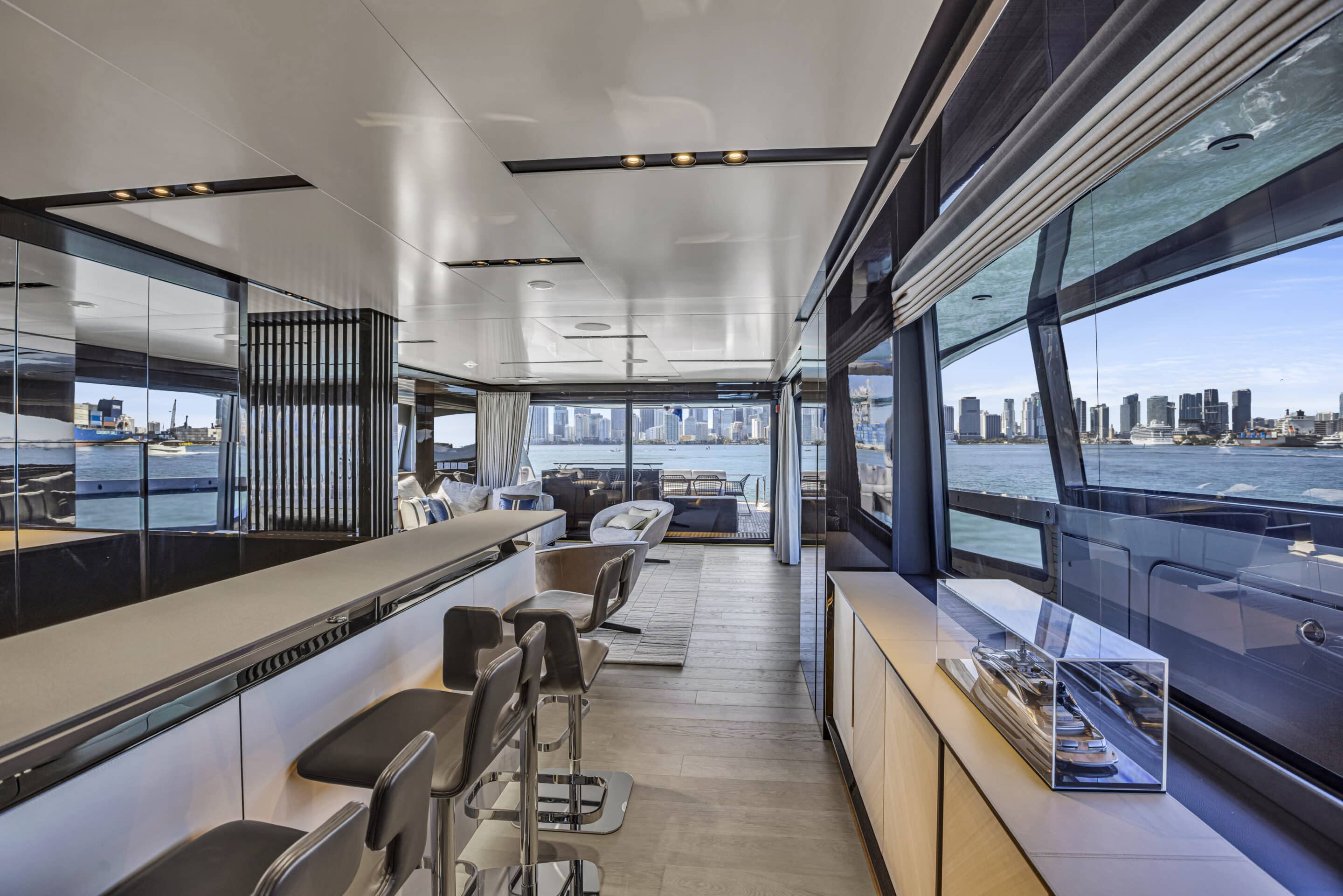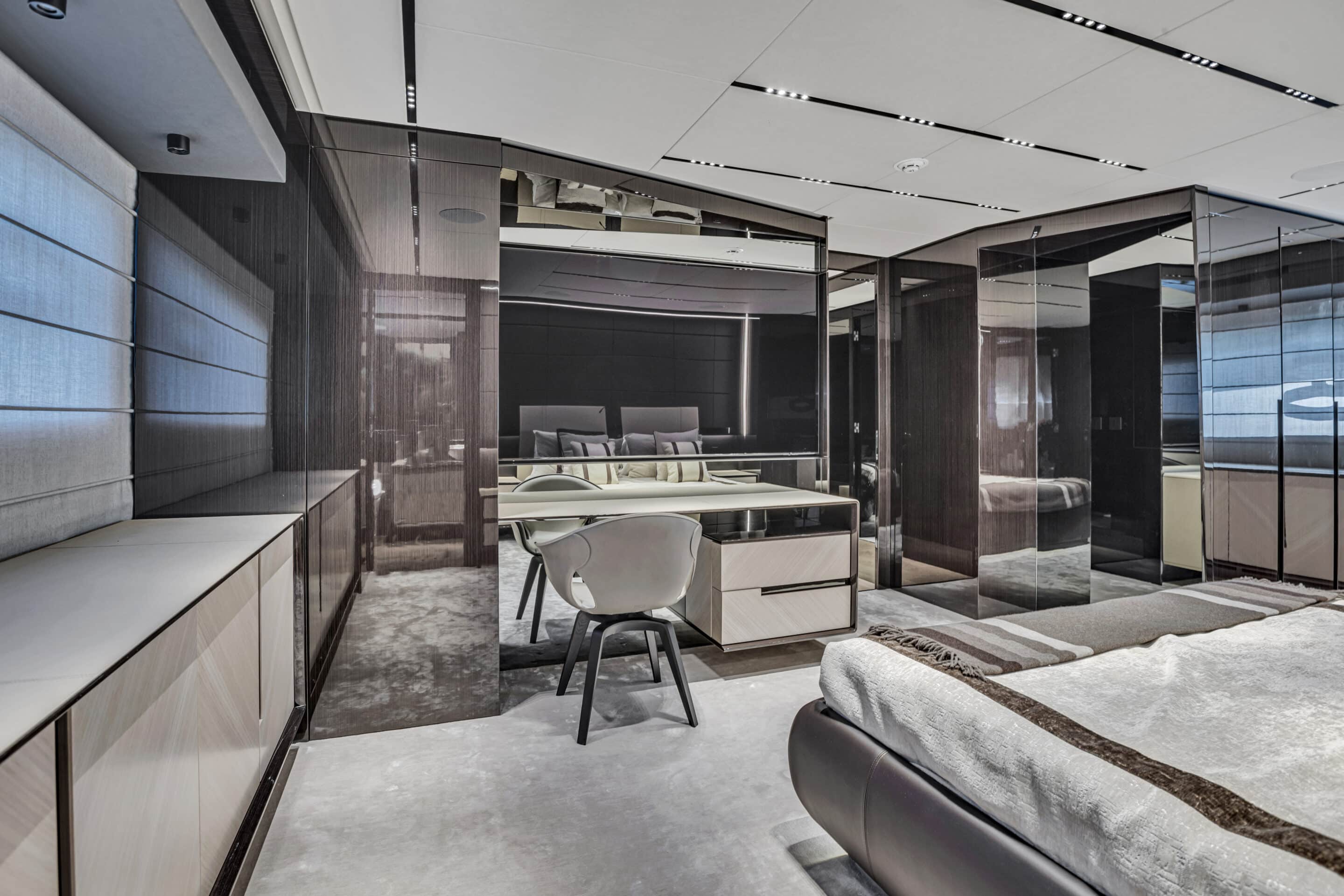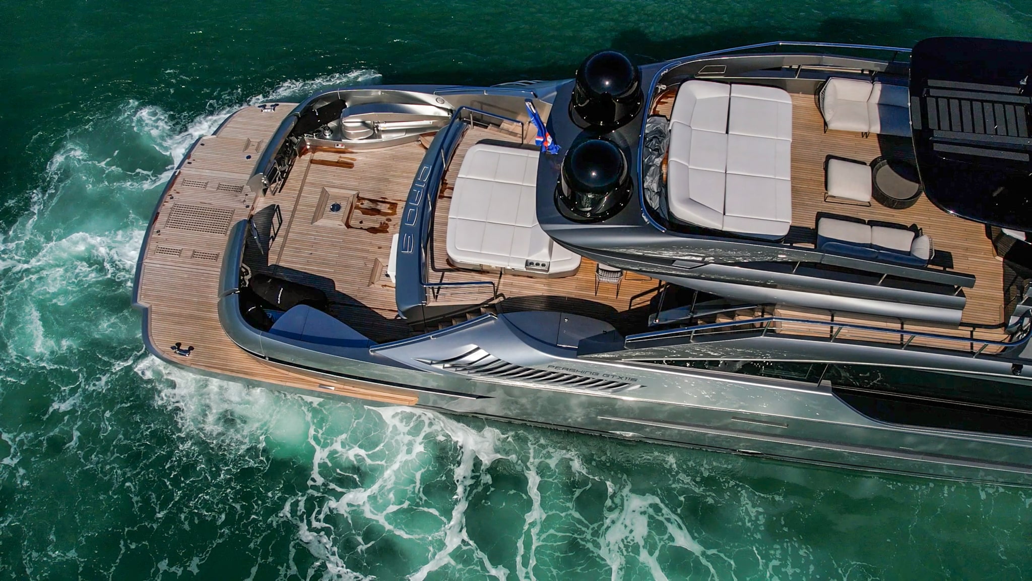 Designed by Fulvio De Simoni in collaboration with the Ferretti Group, the yachtβs striking Monte Carlo Grey exterior draws inspiration from aviation and classic GT cars, sculpted in lightweight fiberglass and carbon fiber for maximum efficiency. Outdoor living is elevated across three dynamic levels, anchored by an extraordinary 40-square-meter beach club with hydraulic terraces that open seamlessly to the sea. A panoramic cockpit with dining, lounge, and bar flows effortlessly into the yachtβs social spaces, while a 40+ sqm sport bridge offers a bar, sun lounge, and secondary helmβperfect for entertaining at speed. A concealed tender garage accommodates a 5.2-meter tender and jet ski, ensuring adventure is always within reach.