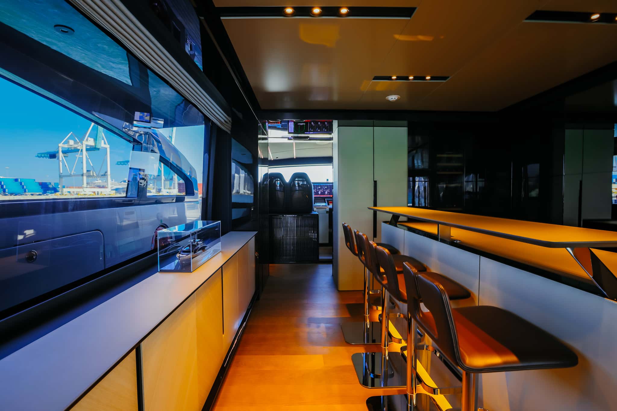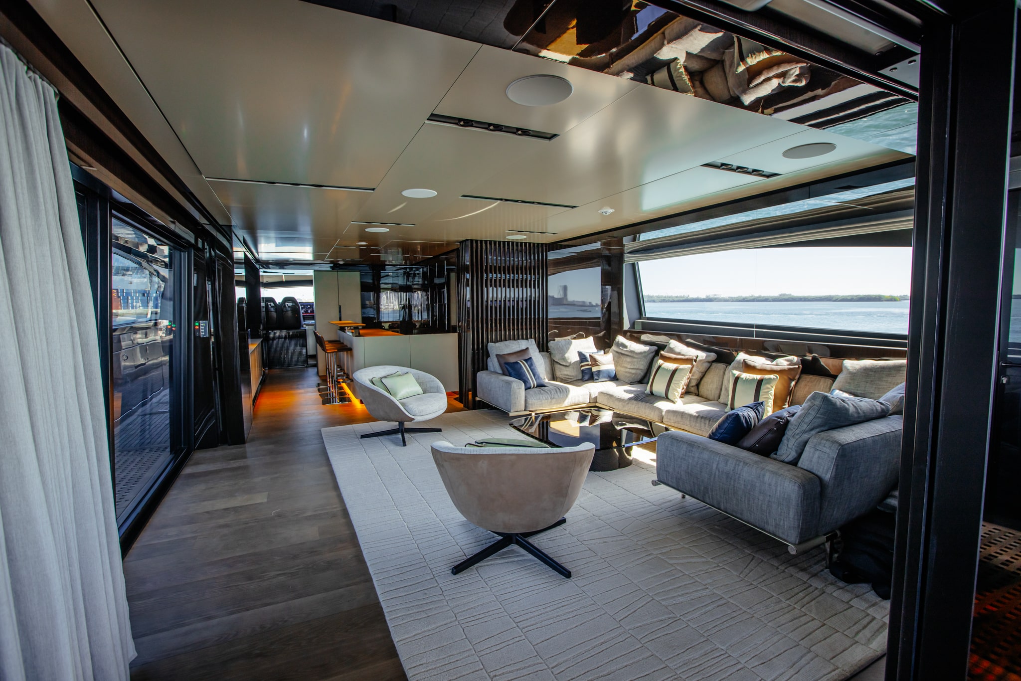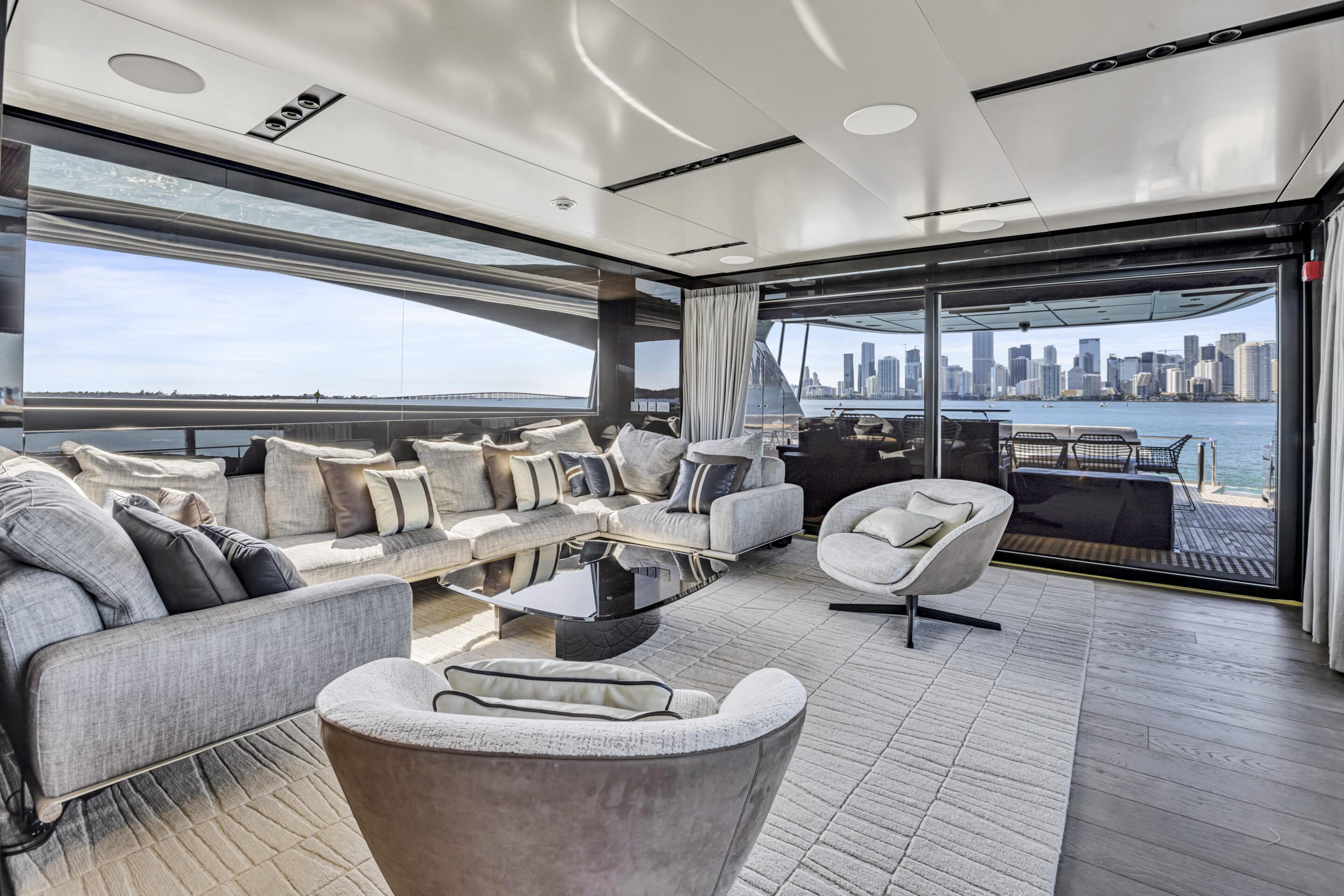 Designed by Fulvio De Simoni in collaboration with the Ferretti Group, the yachtβs striking Monte Carlo Grey exterior draws inspiration from aviation and classic GT cars, sculpted in lightweight fiberglass and carbon fiber for maximum efficiency. Outdoor living is elevated across three dynamic levels, anchored by an extraordinary 40-square-meter beach club with hydraulic terraces that open seamlessly to the sea. A panoramic cockpit with dining, lounge, and bar flows effortlessly into the yachtβs social spaces, while a 40+ sqm sport bridge offers a bar, sun lounge, and secondary helmβperfect for entertaining at speed. A concealed tender garage accommodates a 5.2-meter tender and jet ski, ensuring adventure is always within reach.