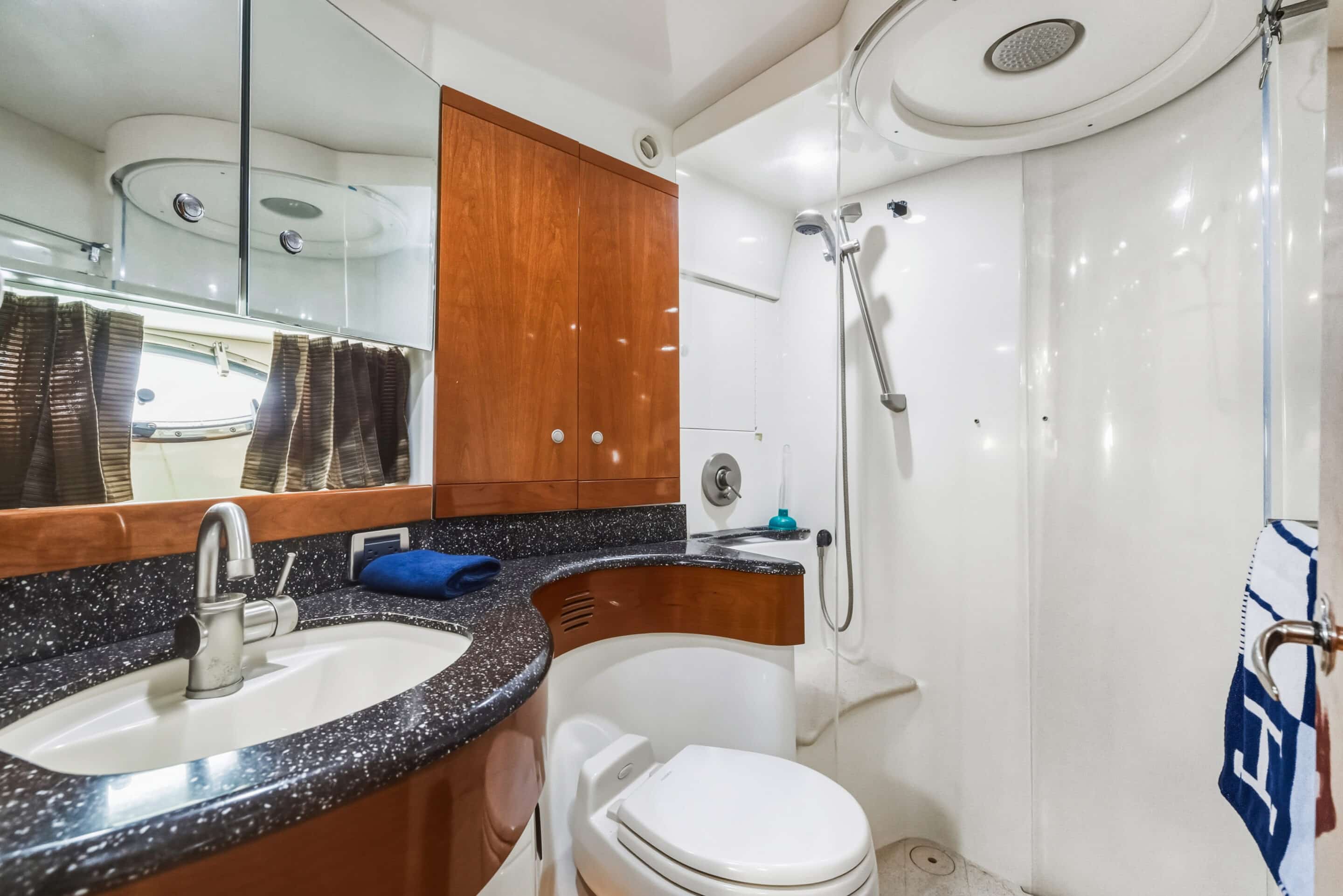 Below deck, two luxurious staterooms offer the ideal retreat after a day on the water. The forward master suite features a centerline queen bed and en suite bath, while the guest cabin includes twin beds that can convert into a queen β both with private heads and showers for added comfort and privacy.