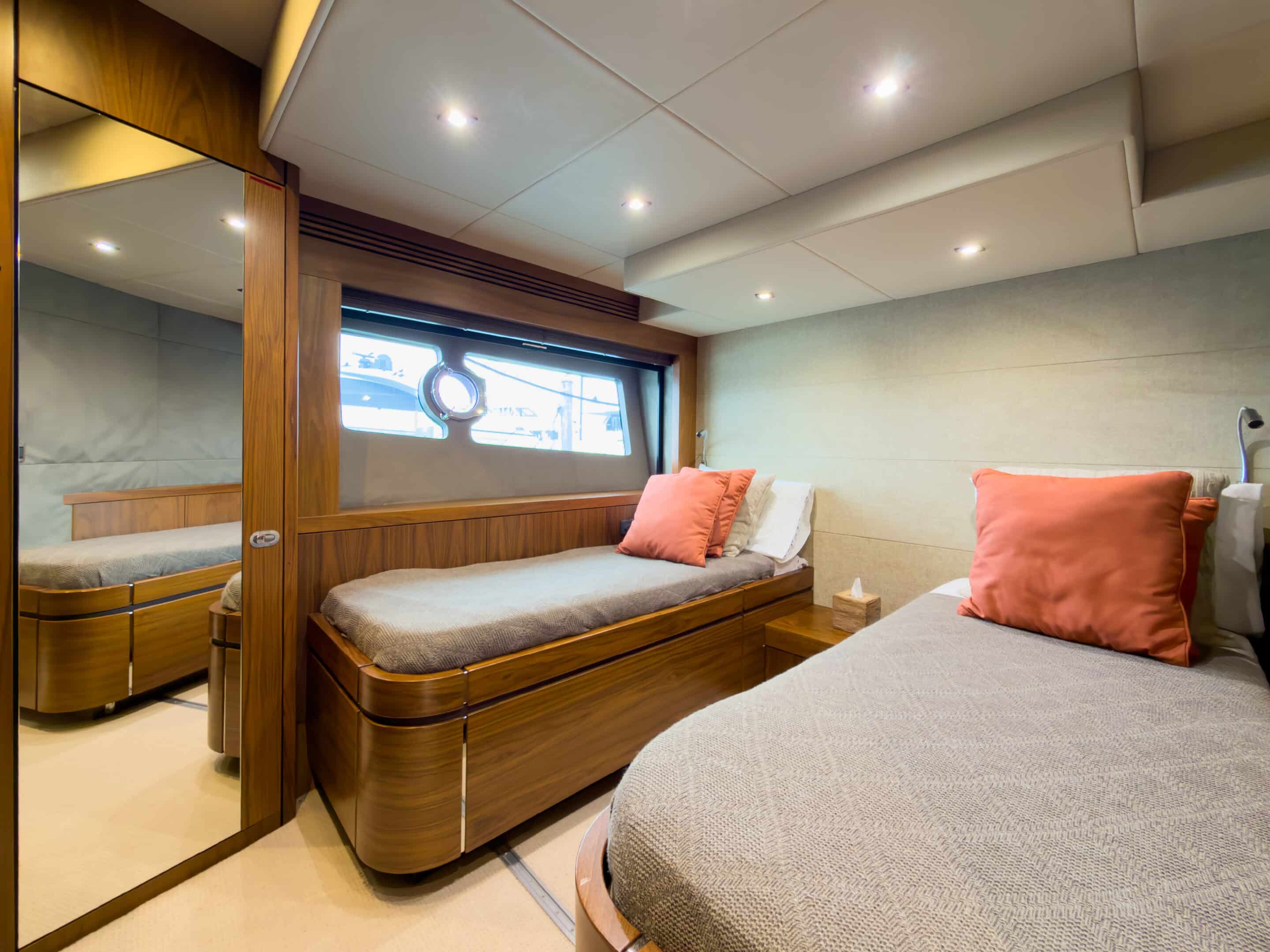 Inside, the open-plan saloon is flooded with natural light through full-length windows, creating a seamless connection to the sea. Below deck, four beautifully appointed cabins β including a spacious master suite and VIP cabin β offer the ideal retreat after a sun-soaked day on the water.